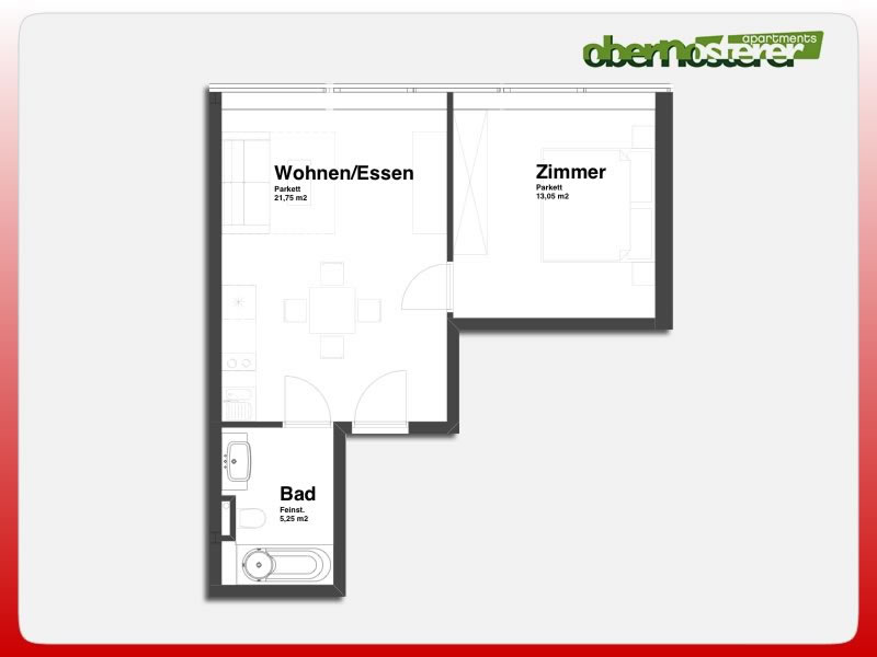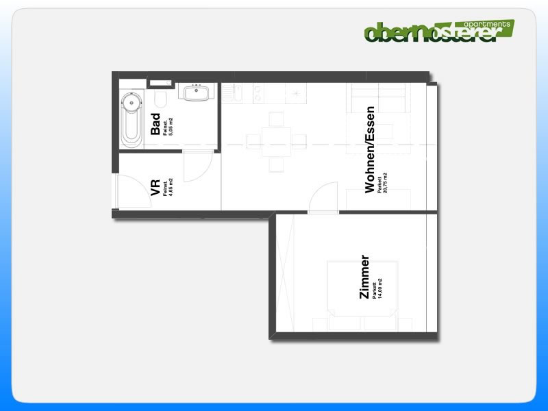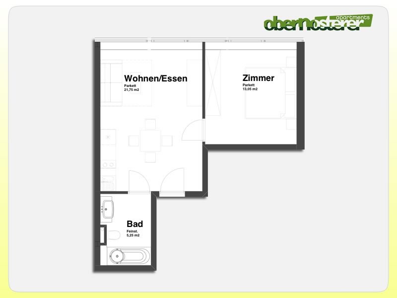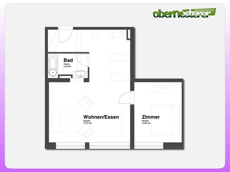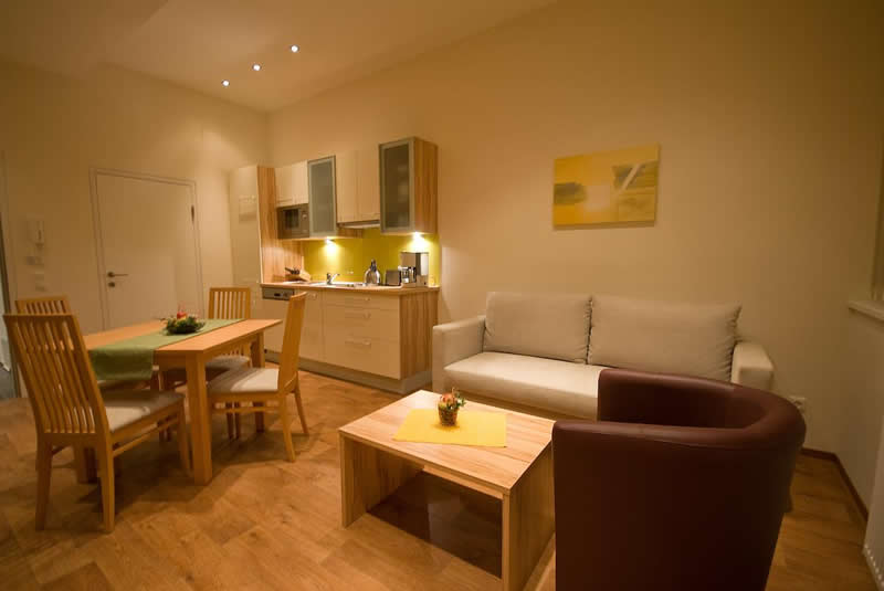 - 1 Wohnschlafraum mit Küche, 1 Schlafzimmer, 1 Badezimmer/WC, Vorraum mit Garderobe