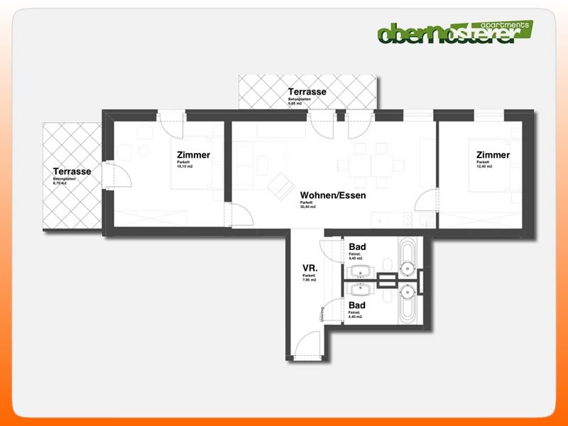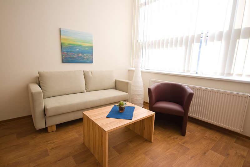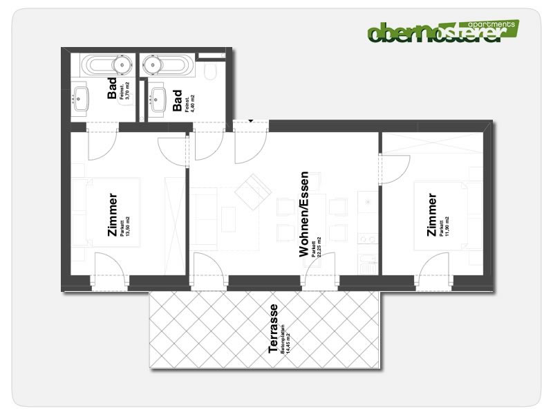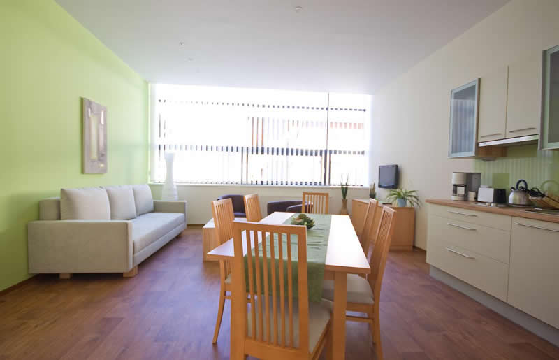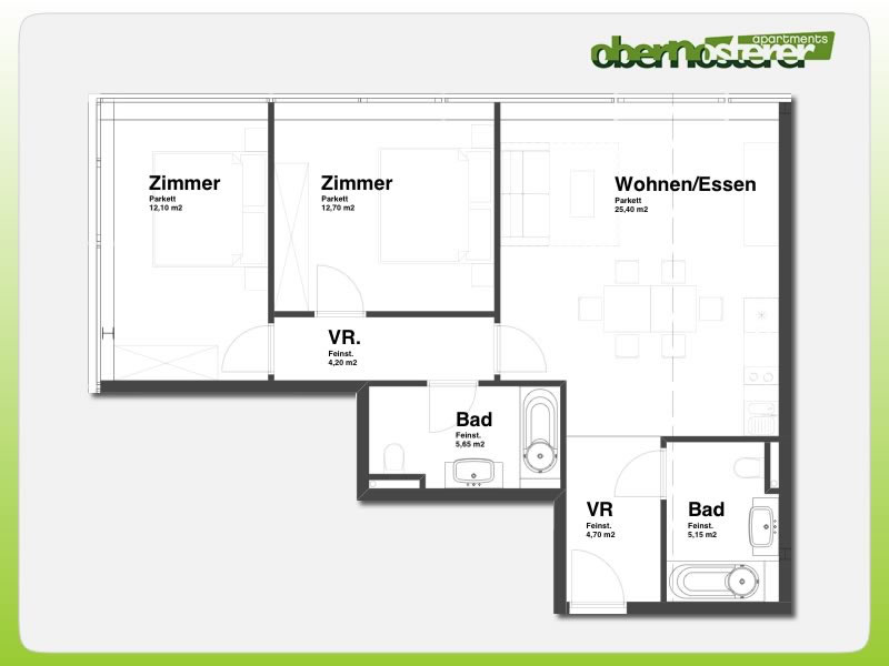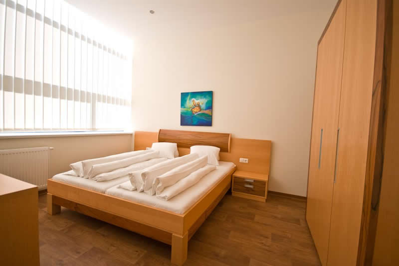 - 1 großer Wohnschlafraum mit Küche, 2 Schlafzimmer, 2 Badezimmer mit Badewanne/WC sowie Vorraum mit Garderobe